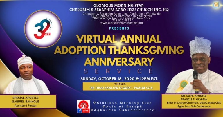News Update Glorious Morning Star To Celebrate 32nd Annual Adoption Anniversary Acts of Seraphs October 15, 2020October 15, 2020